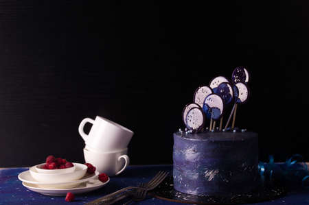 Candy bar. Blue decorated cake standing of festive table with deserts
