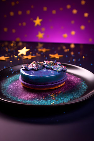 Macaroon with blue glaze on a black plate on a purple background