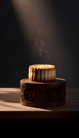 Moon cake on wooden table in dark room. 3d rendering.