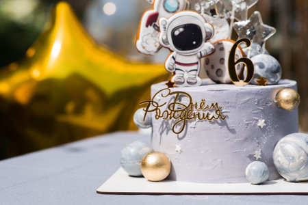 A festive cake at a children's space-themed party. The cake has a Russian inscription: Happy Birthday. There are balloons and a beautiful photo area in the background. The concept is a children's party.