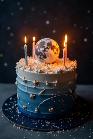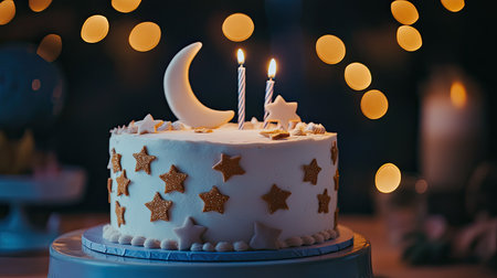 This festive birthday cake showcases a moon centerpiece and candle-lit ambiance, adorned with playful stars and sprinkles, creating a magical atmosphere.