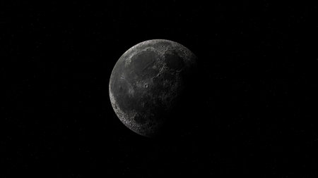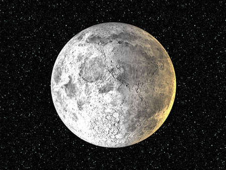 The moon illuminated against a starry black background of CGI image
