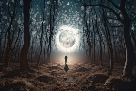 person, walking through a dreamlike forest, with the moon shining above, created with generative ai