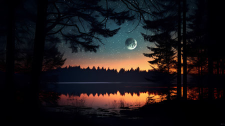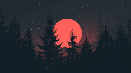Serene Landscape with Dark Forest Silhouettes and Red Moonlit Sky at Night
