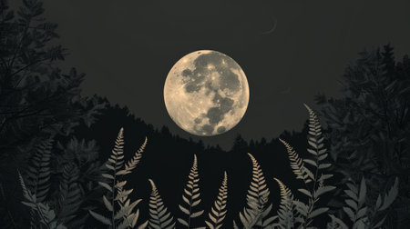 Full Moon Night in Forest Landscape with Ferns and Silhouetted Trees