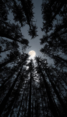 An upward perspective captures a full moon amidst the dark silhouettes of tall trees. The composition features a symmetrical arrangement, with the moon as the central focal point. The scene is dominated by shades of dark blue and black, with the full moon providing a contrasting bright light. This image could be suitable for editorial or illustrative applications.