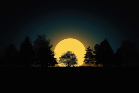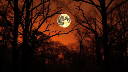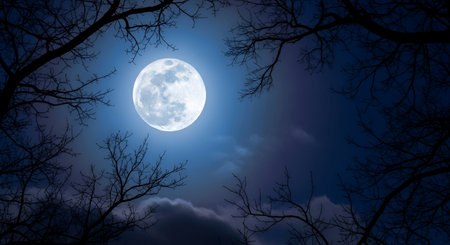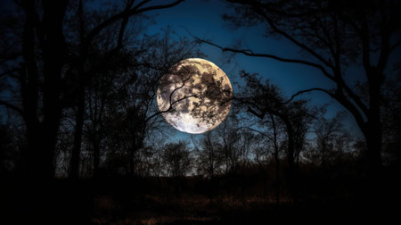 A glowing full moon in a midnight blue sky against a silhouette of trees created with Generative AI
