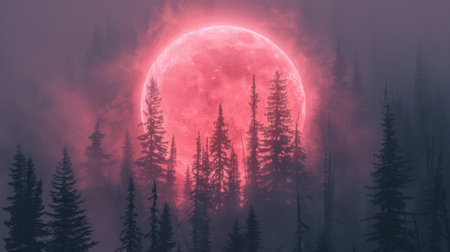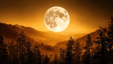 A breathtaking view unfolds as a full moon casts an orange glow amidst a colorful night sky. Pine trees stand tall in the foreground, creating a serene and enchanting atmosphere.