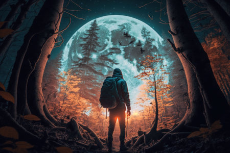 Hiker with backpack on the background of the full moon in the forest. Generative AI