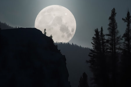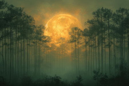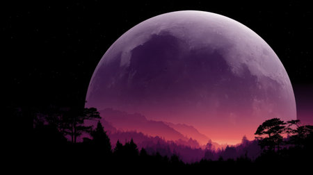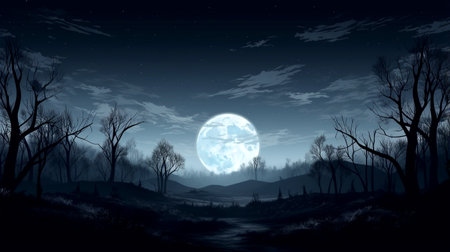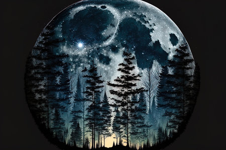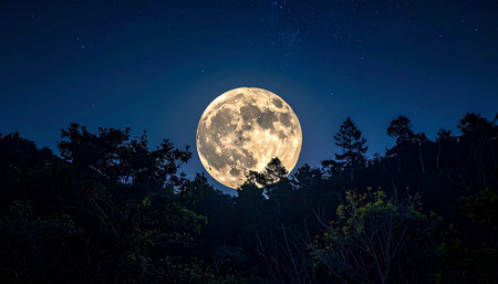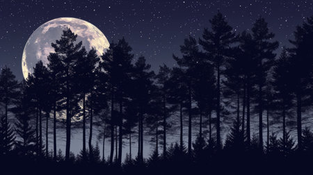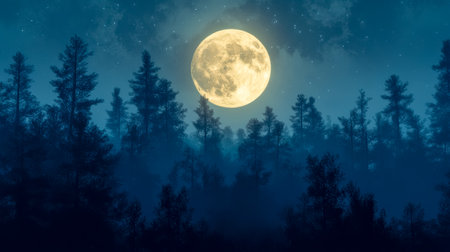 Experience the magic of a stunning full moon night over a serene forest landscape under a starry sky