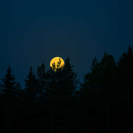 Round shining full moon. Orange moonlight on dark night sky. Moonrise over a forest with spruce tree tops silhouettes at evening dusk. Scenic skyline in twilight. Illuminated natural view in darkness.