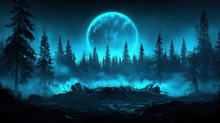 Silhouetted pine trees stand in a misty forest bathed in an eerie blue moonlight, creating a mysterious and atmospheric night scene.