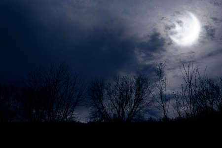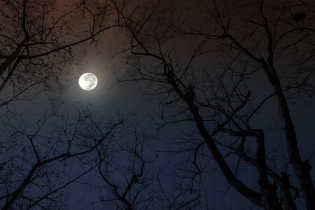 Silhouette of dry tree in the night with full moon in the darkness sky.