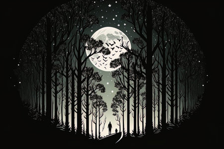 A captivating forest scene illuminated by a bright full moon, featuring bats flying across a mystical night sky, creating a serene and enchanting atmosphere.