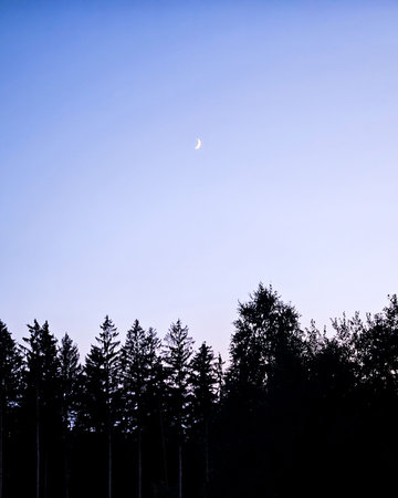 Crescent Moon in Evening Sky Framed by Forest Trees.