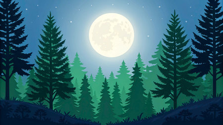 Forest landscape with full moon and spruce trees. Vector illustration.