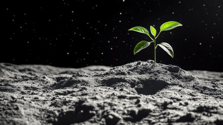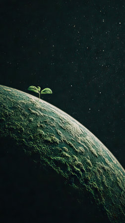 A single sprout emerges from a textured, spherical form in this artistic composition. The image displays shades of green and dark hues, with an emphasis on texture and detail. The scene is set against a dark, starry background, giving a sense of space. Potential uses include designs and illustrations.