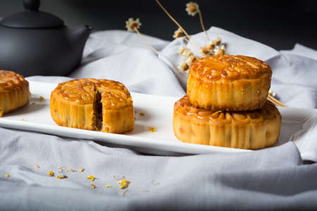 Delicious Mooncake, a kind of traditional Chinese Snack for Mid-Autumn Festival on the Table.