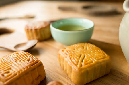 Moon cakes for Mid-Autumn Festival on wooden table with tea.