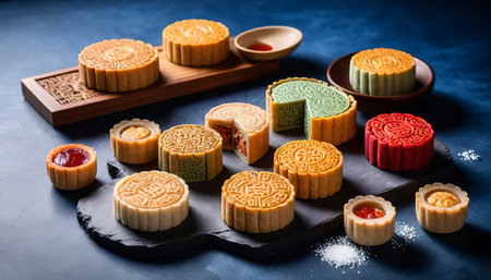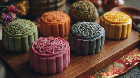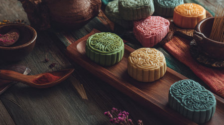 A beautiful arrangement of colorful mooncakes on a rustic wooden table, showcasing the rich traditions of Chinese culture and festive celebrations.