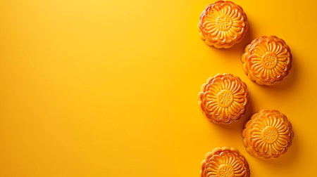 Moon cakes on a yellow background, top view, copy space.