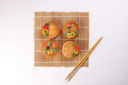 Colourful flower decorated mooncake Chinese mid autumn festival on bamboo food mat chopsticks white background