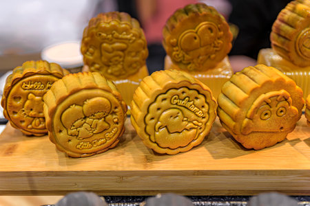 Singapore - September 12, 2019: Ornate freshly made traditional Chinese mooncakes on display for sale at mid autumn festival