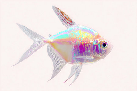 A transparent fish with shiny scales swims in front of a clean white backdrop, showing off its colors.