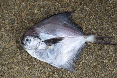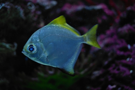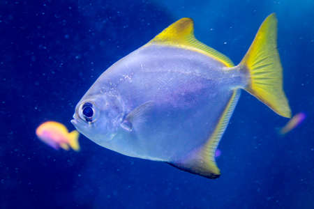 Pompano. Silver fish with long yellow fins in marine aquarium