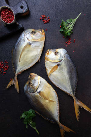 Vomer cold smoked fish on a black background with spices. Marine useful fish. Natural omega. Vertical photo. Top view.