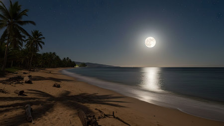 A full moon illuminates a beach scene, casting a shimmering path across the ocean. Palm trees are silhouetted against the dark sky. The composition emphasizes the contrast between the sandy foreground, the calm water, and the moonlit horizon. Suitable for various projects including travel and environmental themes.