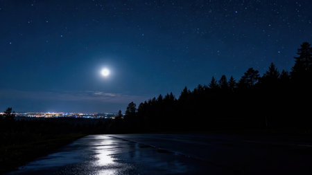 Luminous full moon reflection on the damp asphalt road surface contrasting with the distant twinkling city lights and the shadowy ridge of evergreen pine trees under a deep blue starry sky.