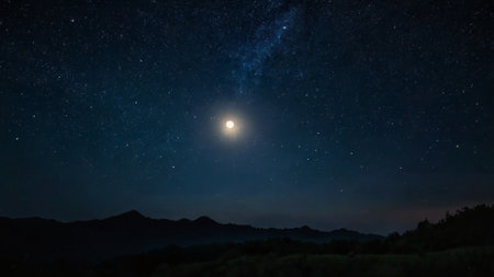 In the stillness of night, a bright full moon casts its glow over majestic mountains, surrounded by a deep blue sky filled with stars, creating an enchanting atmosphere.