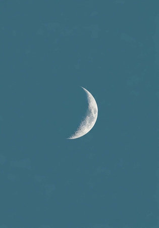 A crescent moon shining in a starless night sky, surrounded by the subtle halo of moonlight