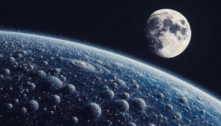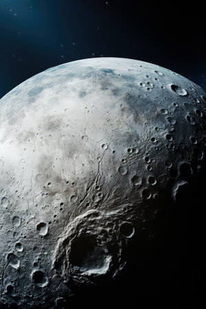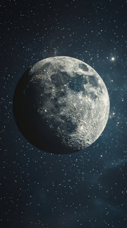 Detailed close-up of a full moon glowing brightly in a clear night sky, surrounded by sparkling stars, capturing the serene beauty of the lunar landscape and the cosmos.