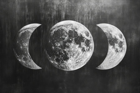 A photo capturing the three primary phases of the moon in a stark black and white color scheme, A moon-phase design in black and white, AI Generated