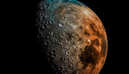 Close up of the surface of rhea, saturns second largest moon, revealing a heavily cratered landscape emerging from the shadows, creating a dramatic contrast against the blackness of space
