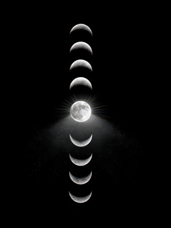 Captivating image of the lunar phases set against a dark sky, highlighted by a radiant full moon and ethereal starburst effect, evoking a sense of tranquility and wonder.