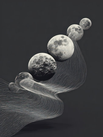 This abstract illustration features multiple moons progressing in size, intertwined with flowing lines against a dark background, creating a captivating cosmic effect.