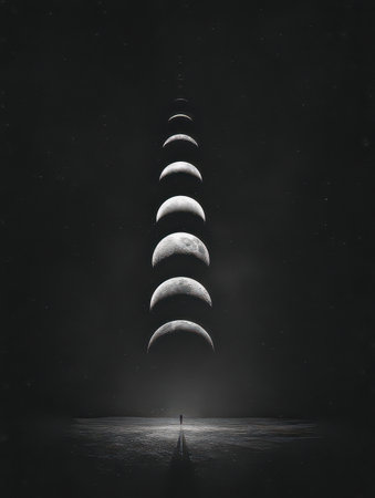 A striking visual of the lunar phases displayed in a vertical alignment, set against a tranquil landscape that evokes solitude and wonder, inviting exploration.