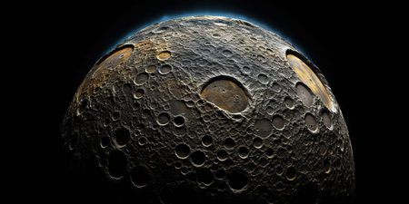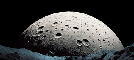 A close-up view of a dark, crated moon against the black backdrop of space. Mysterious and awe-inspiring.