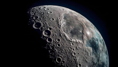 The lunar surface features numerous craters and rugged textures illuminated by distant sunlight in the blackness of space. This celestial view highlights the moon's geological history.