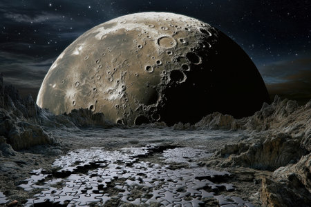 A stunning lunar scene shows a big moon and scattered puzzle pieces on the surface.