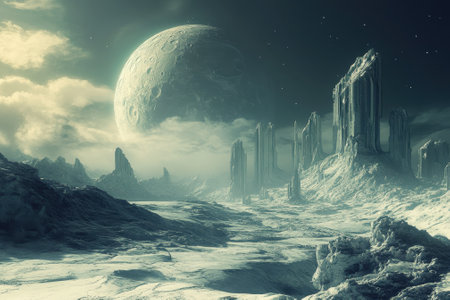 Striking extraterrestrial terrain features jagged peaks and monolithic structures under a luminous moon.
