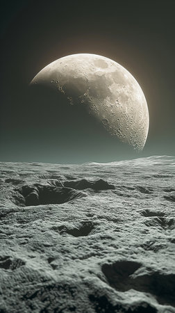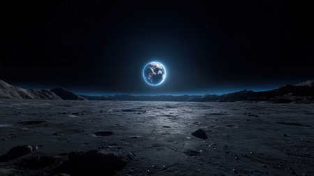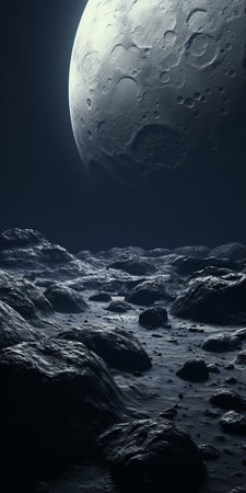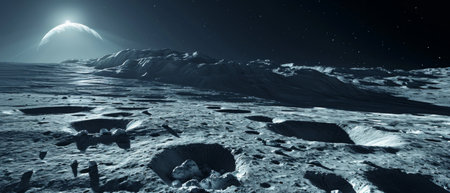 Exploring the desolate lunar landscape with craters and mountains under a celestial body