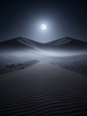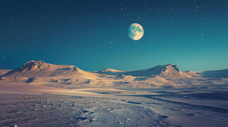 This stunning image captures the majestic beauty of a moonrise over a serene desert landscape blanketed in snow. The tranquil scene is set under a clear night sky sprinkled with stars, where the glowing moon illuminates the snow-covered dunes and rugged mountain peaks in the distance. The calm and isolation of the desert at night are palpable, with the cold blue tones of the snow contrasting with the warm hues of the moonlight. Ideal for backgrounds, this picture encapsulates the quiet and awe-inspiring moments that nature affords, suitable for themes of exploration, tranquility, and the contrast of climates.
