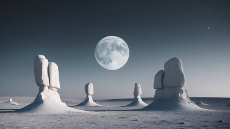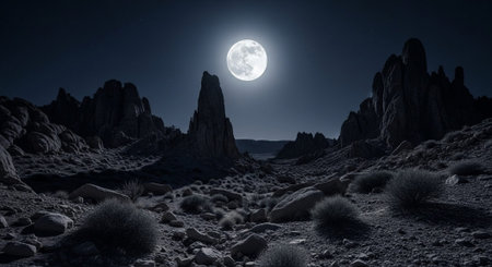 AI Generated. Eerie Rock Formations Under a Full Moon in a Desolate Landscape