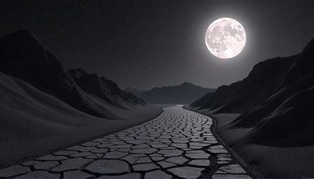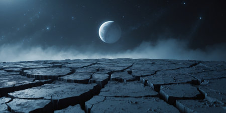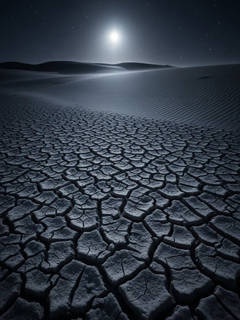Moonlit desert landscape with cracked earth path in darkness