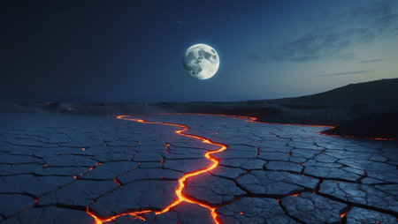 AI Generated. Majestic Moon Over Cracked Earth with Glowing Lava Cracks at Night