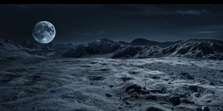 Experience the exquisite beauty of a lunar landscape captured in black and white, showcasing the full moon and a star-filled sky.